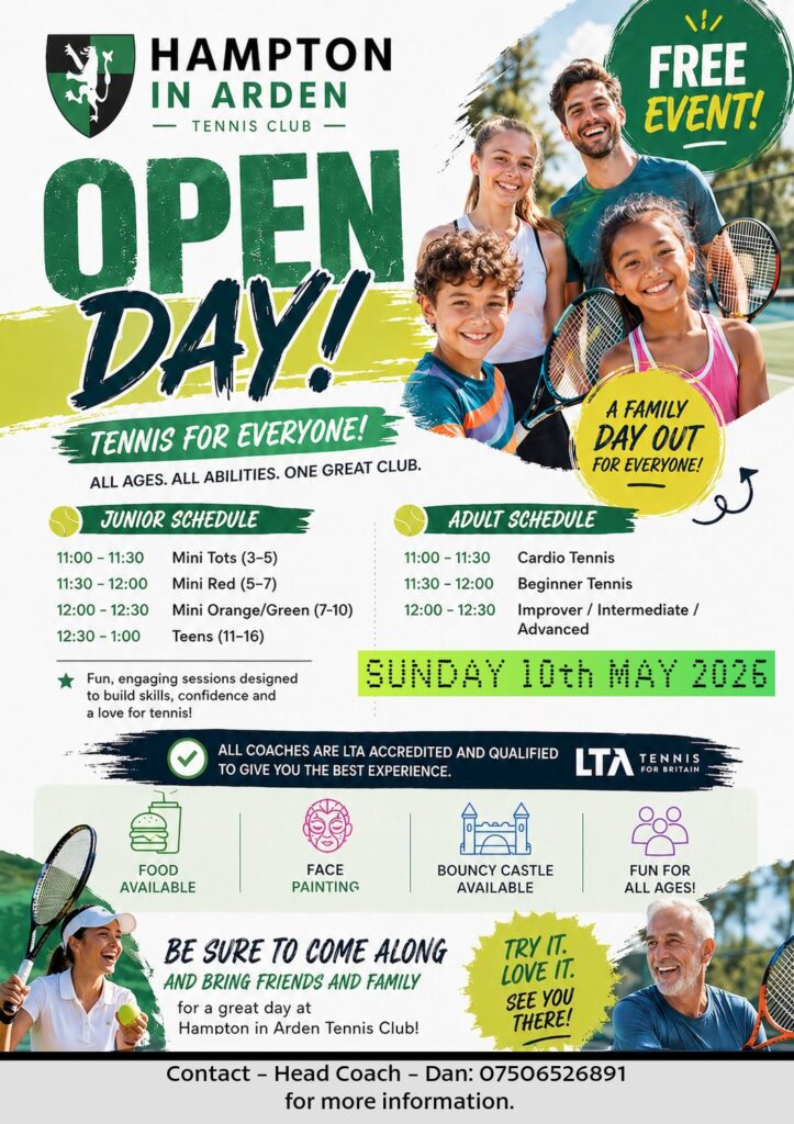 We are holding a Tennis Club Open Day – Sunday 10th May 2026. This is for anyone to try out the Tennis Club and Coaching. If you have friends that might be interested, please tell them about it!